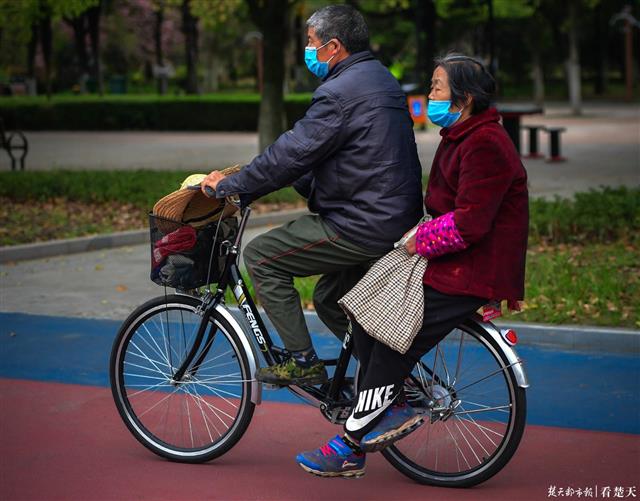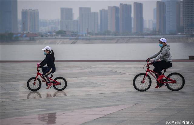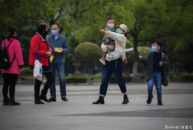 记者在公园内的市政广场看到,汉口江滩公园内陆续有市民前来游玩,老人与小孩居多,大家来健身、溜娃、赏花…… 享受这闲暇的时光,不时有身着保安制服的工作人员骑着电动车来回巡视,提醒没有戴口罩的市民戴好口罩。大家静静的游玩着,并无喧嚣,更没有往日的繁华。