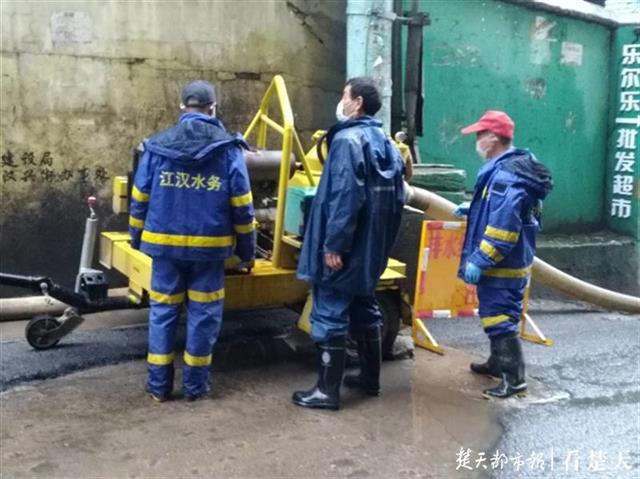 为尽快畅通社区进出口,江汉区水务和湖泊局排水队紧急调动2台流动泵车进行临时抽排,今天早上7时,该处渍水基本消退。