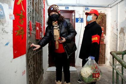 武汉市政协下沉社区干部(右)与社区志愿者(左)为独居老人送菜。