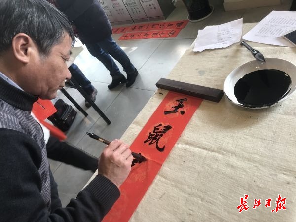 来到活动现场,长江日报-长江网记者注意到想得到现场墨宝的市民已经排起了长队。地书协会各路“大神”正在以行、草、隶、篆等多种书体挥写书法神韵,一幅幅具有鼠年色彩的春联片刻写就。随着时间的推移,越来越多的路人加入到这场活动中。