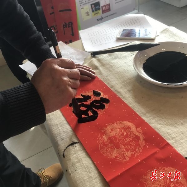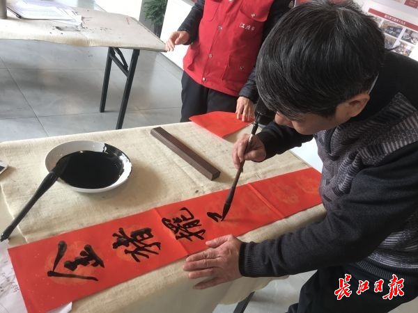 长江日报-长江网1月12日讯(见习记者王怡人 通讯员向丽华)12日上午10点,市江滩办联合武汉地书协会在汉口江滩三阳路志愿服务之家开展“迎新春·送春联”送福新春活动,地书协会的书法行家为市民现场泼墨写就春联与福字。