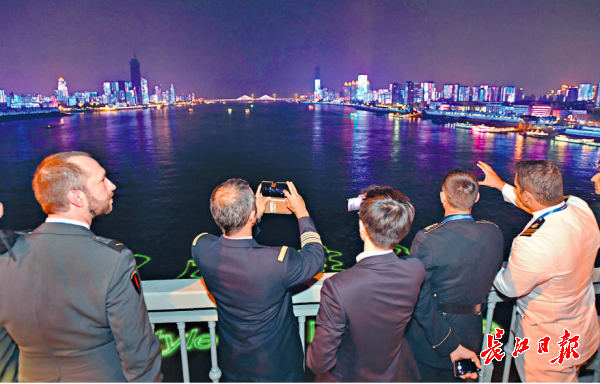 10月19日晚,武汉长江大桥上,来自各国的军运会嘉宾欣赏长江灯光秀。 记者苗剑 摄