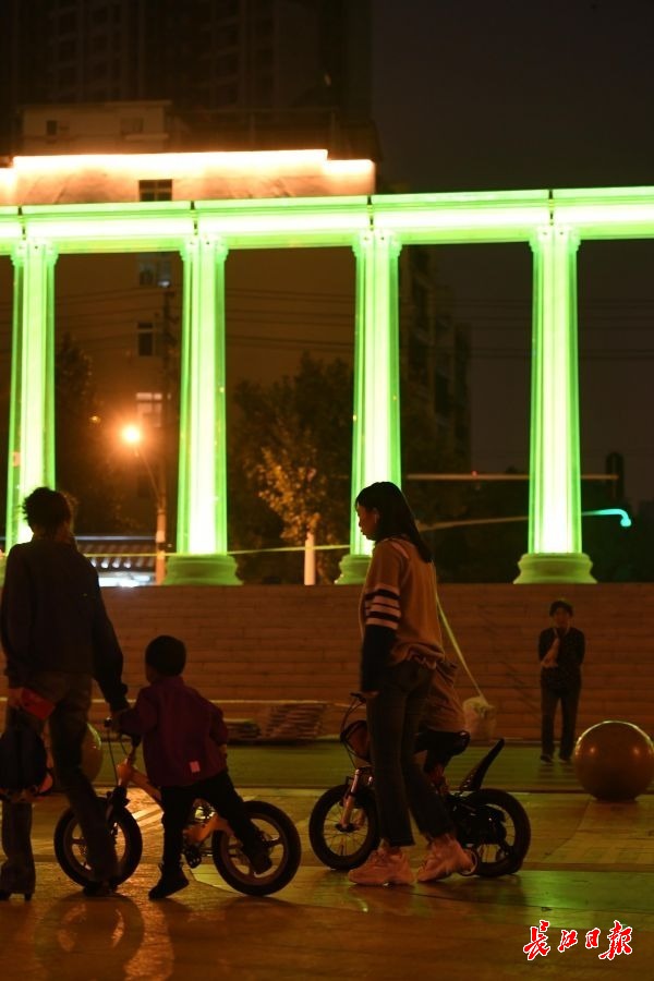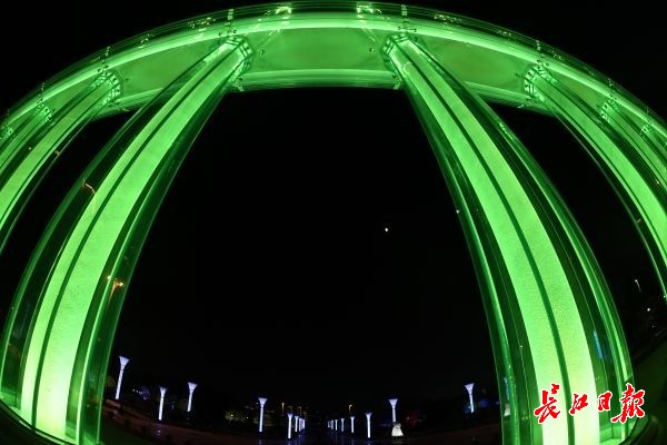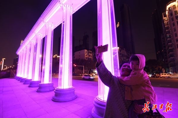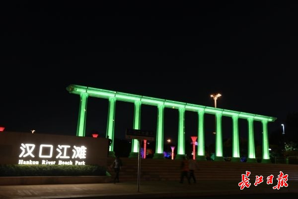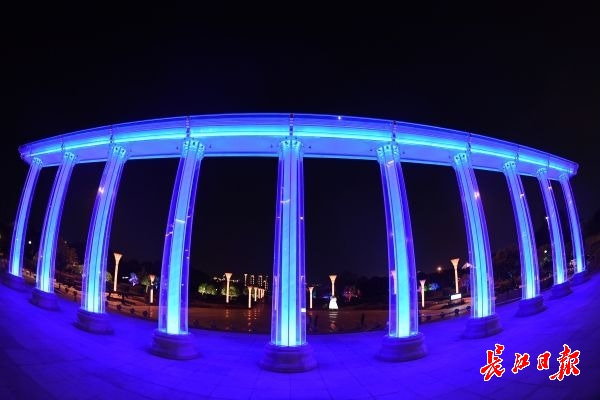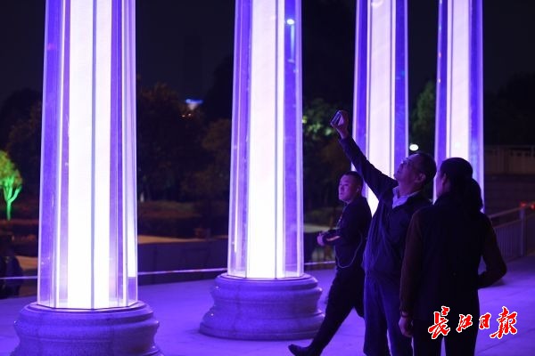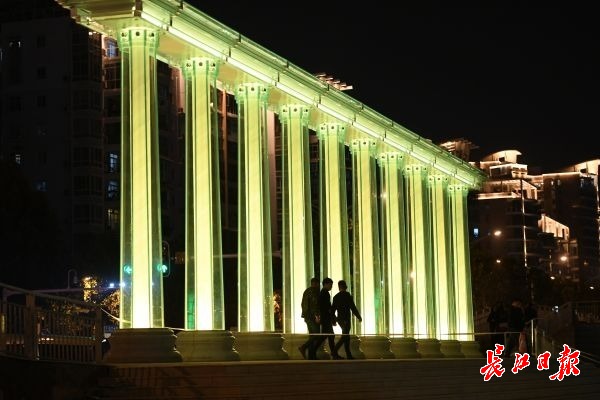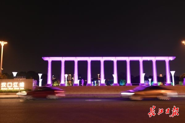 长江日报-长江网11月7日讯 11月7日晚,汉口沿江大道韦桑路路口,一座色彩斑斓的柱式大门,矗立在江滩入口处。立柱内闪耀着各种色彩,颇为壮观。据了解,该滨江门由10根罗马柱组成,每根柱高6米,直径80厘米,顶部由1.6米宽的连梁连为 一个整体。罗马柱外侧由8片钢化玻璃组成,柱底与玻璃幕墙之间环绕有一圈细密的射灯,使滨江门从不同角度呈现出不同的色调,灯光的变化成为夜间一道别致风景。