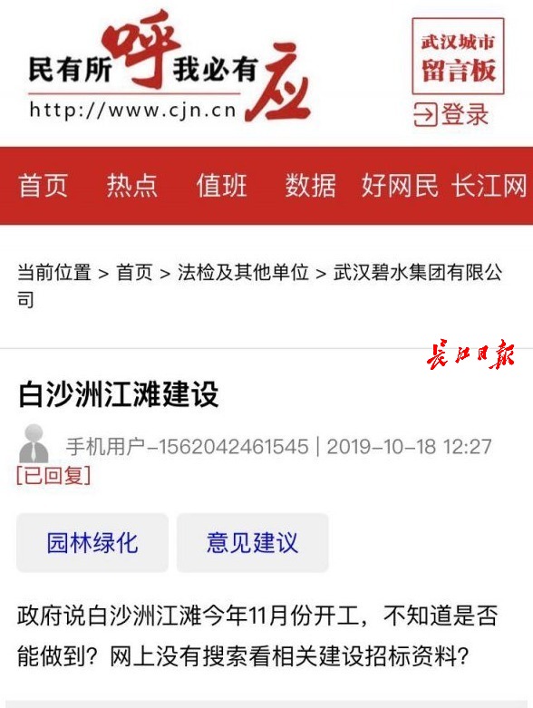10月31日,武汉碧水集团有限公司的最新回复称,白沙洲江滩为拟修建的长江主轴长江右岸洪山江滩防洪及环境综合整治工程(杨泗港大桥至白沙洲大桥段),该项目的初步设计已经武汉市发改委批复(2019年10月),目前正在进行项目招标工作(网上可以搜索到招标公告),预计2019年12月底开工建设,力争2021年对市民开放。