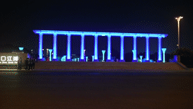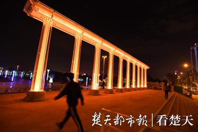 昨晚,汉口江滩游人如织。在汉口沿江大道韦桑路路口,记者看到,一座色彩斑斓的柱式大门,矗立在江滩入口处。立柱内,不时闪耀着各种色彩,与周边景观交相辉映,颇为壮观。中建三局现场生产经理张纯称,该滨江门由10根罗马柱组成,每根柱高6米,直径80厘米,顶部由1.6米宽的连梁连为一个整体。罗马柱外侧由8片钢化玻璃组成,柱底与玻璃幕墙之间环绕有一圈细密的射灯。这一造型,使滨江门从不同角度呈现出不同的色调,随阳光、月色、灯光的变化给人以动态的美,白天在光照作用下耀眼夺目,晚上通过照明设计成为别致风景。
