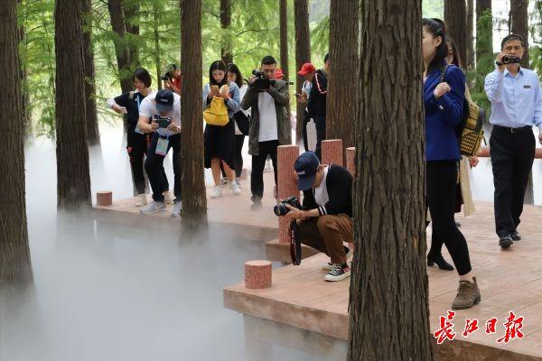 路线的第二站来到东湖落雁景区,景区内的九曲桥穿梭在一片池杉林中。在2019年的提档升级后,桥下新增了水雾效果,仿佛置身仙境、云雾缭绕,人与自然和谐共处、得天独厚的生态环境让人流连忘返。景区导游介绍,此景点已成为汉服爱好者的打卡胜地。