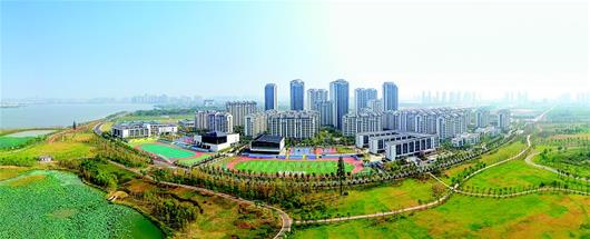 图为:武汉江夏区黄家湖畔,碧水环抱的武汉军运会运动员村。(湖北日报全媒记者 柯皓 摄)