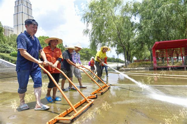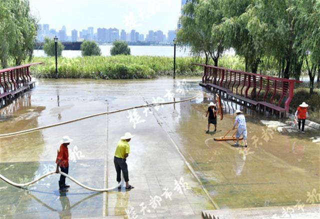 今天,随着江水持续回落,从横渡长江博物馆到长江二桥一段,约2.2公里长的江滩全面露出25米亲水平台。中午时分,记者在现场看到,由于受江水长时间浸泡,平台上残留这不少黄褐色的泥沙。十多名工人师傅顶着烈日,一边用高压水枪冲洗,一边对泥沙进行铲除。