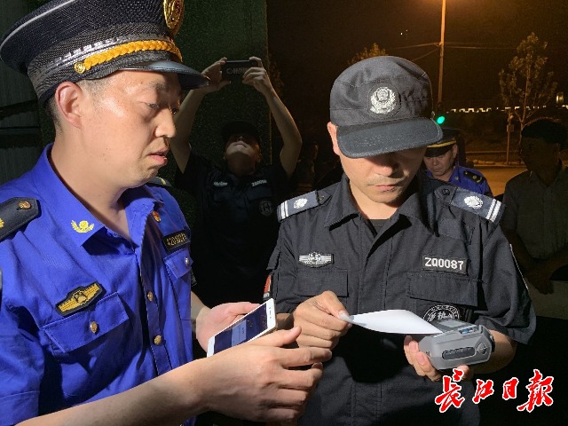 4日22时,长江日报记者随城管执法人员来到沿江大道二曜路口,这里的一个工地灯火通明,而且一台挖掘机仍在施工。城管执法人员当场询问,此处夜间施工是否经过审批?得知该工地未办理夜间施工许可证后,城管开具了责令限期改正通知书,要求立即停止施工。半小时后,城管复查时,工地大门已经关闭,灯光熄灭,现场已停止施工。