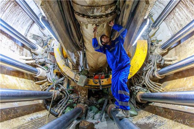 35岁的盾构工程师何斌是陕西汉中人,除在地面开展组织施工、进行资源调度外,他还要走到盾构机内部跟班检查驱动线路和油管,确保盾构机高效运转。