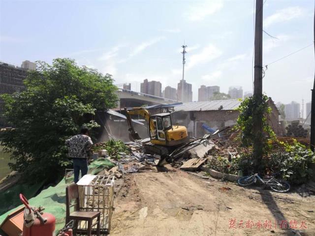 从二七大桥匝道处,可以清楚地看到这些违建,作为军运会环境提升整治重点区域,武昌区杨园街依法对罗家港泵站下达执法文书,但业主拒绝实施自拆,日前,武昌区杨园街组织执法力量,先后对临江、临渠围墙、屋顶违建和棚子等违建进行拆除,拆除违建585平方米。