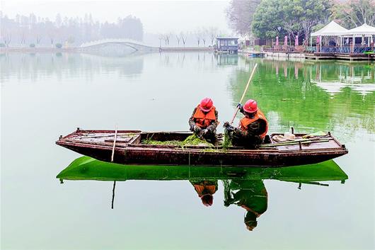 图为:工人在听涛景区治理后的湖水中栽种水草。(湖北日报全媒记者 梅涛 摄)