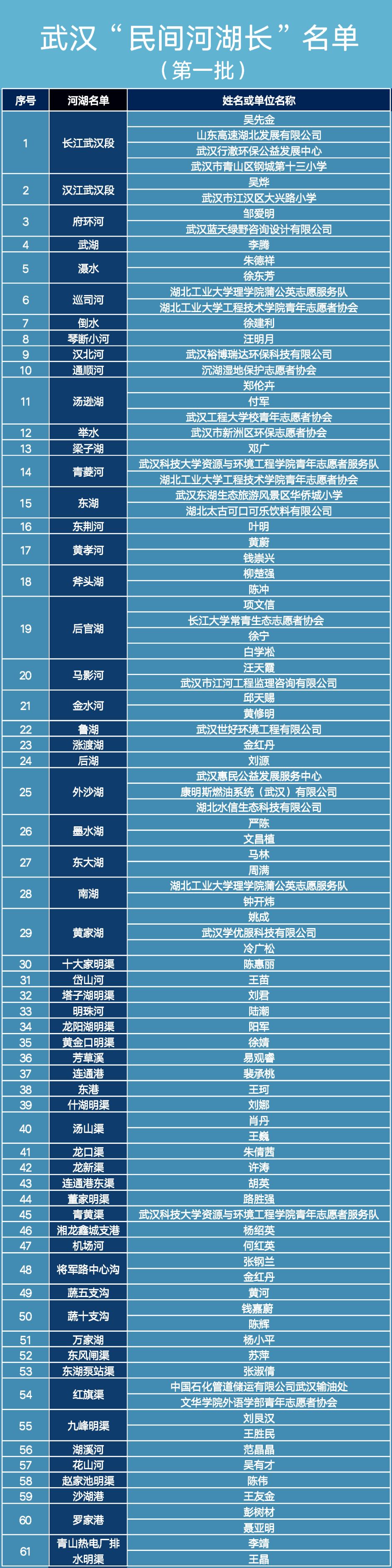 2018年9月,受武汉市河长制工作领导小组办公室的委托,武汉爱我百湖志愿者协会通过媒体面向社会公开征集武汉市61个重点河湖的民间河湖长。根据《武汉市深化河湖长制推进“三长联动”工作方案》《武汉“民间河湖长”管理办法》,活动组通过发布征集公告、报名、走访面谈、资格审查等环节综合筛选后,最终研究敲定了93名武汉民间河湖长。