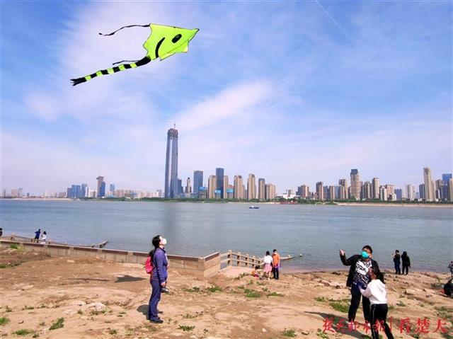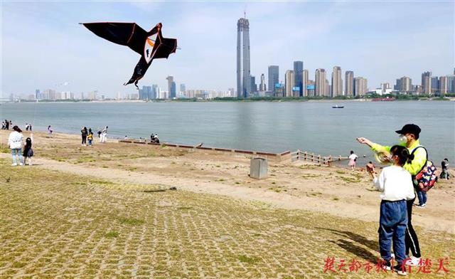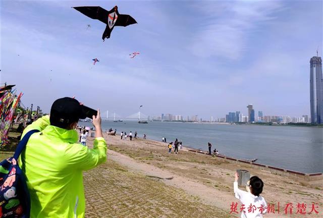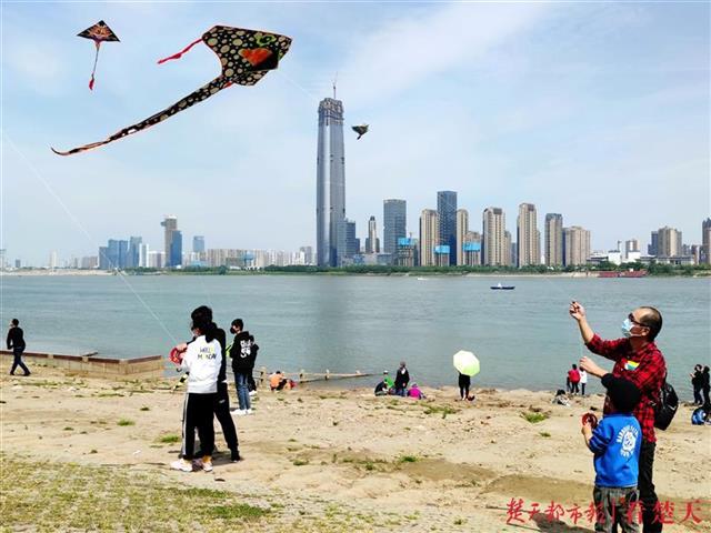 在汉口江滩公园,不少小朋友手执线轴,迎风奔跑,蔚蓝的天空中飞舞着各式各样的风筝,它们颤颤悠悠,互比高低,都在向着蓝天,向着白云,展翅飞翔。