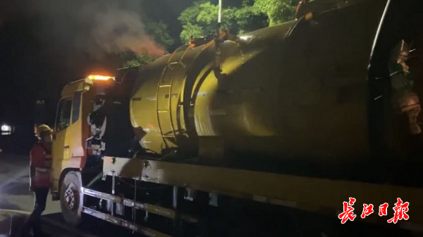 持续人工作业,时间一分一秒过去。23日零时30分,箱涵内的大块淤泥砂石基本被清理干净,吸污车登场。一根大腿粗的水管被传递下去,随着发动机的低鸣,大量污水淤泥被抽进车里。