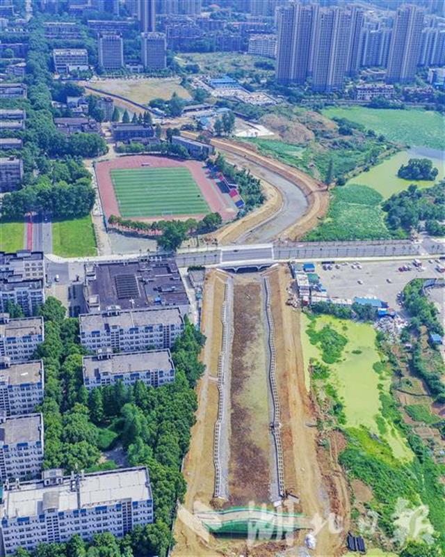 6月3日,俯瞰湖溪河河道综合治理工程。长约1530米的湖溪河,南起武汉珞喻东路,北至东湖子湖喻家湖,曾水污染情况严重。历经三年“攻坚”,河道整治工程基本完工。工程包括初期雨水调蓄池及处理,河道、桥梁、生态、景观绿化等12项子工程。建成后可以改善水环境,重构水生态系统,恢复自净能力,营造绿水空间。(湖北日报全媒记者 梅涛 摄)