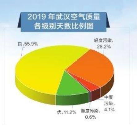 据公报统计,2019年武汉市空气质量优良天数为245天。其中:优41天、良204天、轻度污染103天、中度污染15天、重度污染2天,重度污染天数较2018年减少3天。