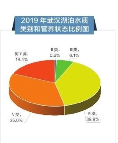 2019年武汉市开展水质监测的湖泊中,只有内沙湖为Ⅱ类水质,四美塘、梁子湖、斧头湖等10个湖泊为Ⅲ类水质,东湖、菱角湖等65个湖泊为Ⅳ类水质,占39.9%;水果湖、南湖、后湖等57个湖泊为Ⅴ类水质,占35.0%;墨水湖、龙阳湖等30个湖泊为劣Ⅴ类水质,占18.4%。另有3个湖泊水体治理,水位过低无法采样,没有监测。按照湖泊水环境功能区划类别评价,湖泊水质达标率为33.9%。