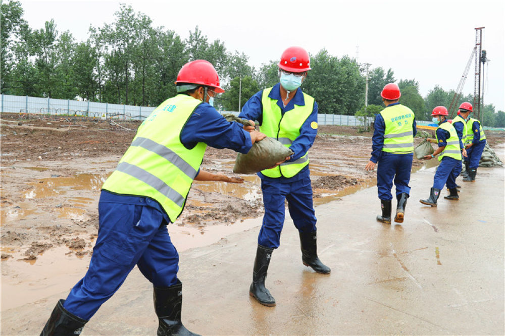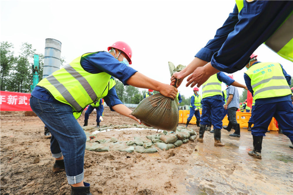 “抢险突击1队负责东区围堰,抢险突击2队负责南边围堰,抢险突击3队负责西边围堰,青年突击队负责北面围堰。”模拟险情发生后,工地巡查人员迅速将相关信息报告至新武金堤路项目公司和武金堤河道堤防管理所。随即,4支抢险突击队共计30余人赶赴管涌地点。在抢险总指挥调度下,突击队员分别担负装填沙袋、传递沙袋和封堵管涌的任务,展开紧急抢险。与此同时,警戒救护组和后勤保障组严阵以待,以应对抢险过程中出现人员受伤等突发状况。整个抢险过程中,队员密切配合,工作紧张有序,险情迅速得到妥当处置。