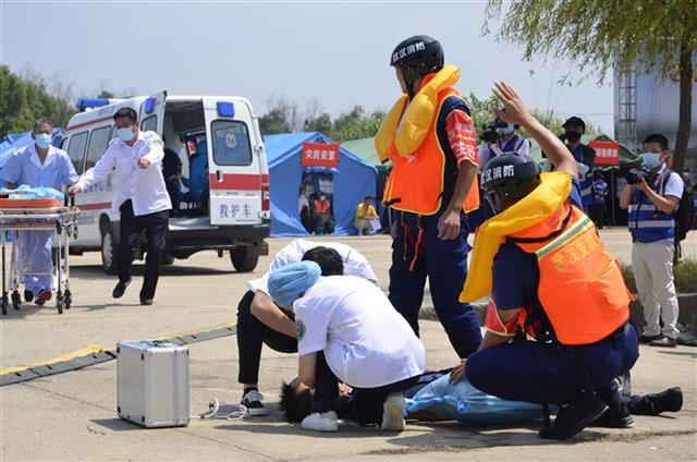 本次演练持续近1小时,共出动东西湖区应急、水务、公安、消防等8支抢险应急队伍,共320余人、700余台(套)装备,完成了管涌抢险、快速排涝、水上搜救和人员转移、散浸处置等4个科目演练。