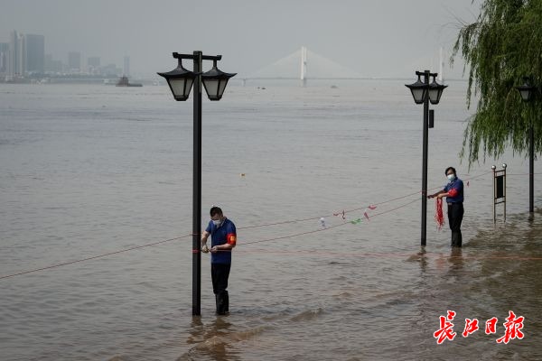 7月6日,在武昌江边,工作人员拉起警戒线。 记者任勇 摄