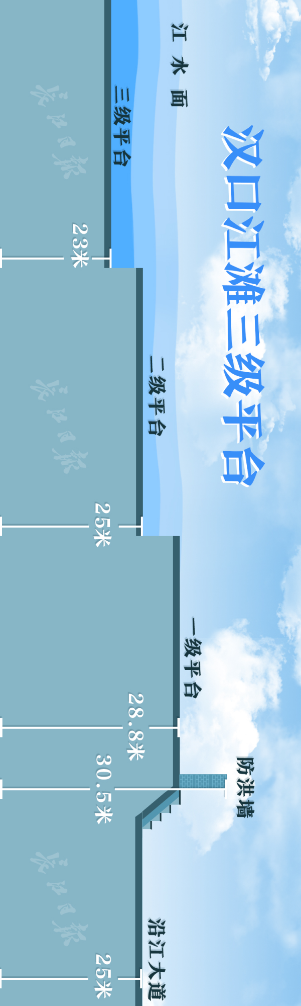一级大平台高程28.8米,该平台的高程相当于武汉市20年一遇的洪水高度。这意味着,在江水不断上涨的过程中,三级平台已经在发挥挡水的作用。