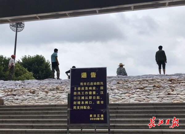 武汉现有多处江滩,其中汉口江滩是建成时间最早的一个。在汉口江滩比较大的人行闸口三阳门,施工人员的封闸工作已经持续两天。