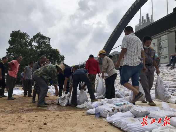 现场工人正紧急地装运沙袋。见习记者龙钦 摄