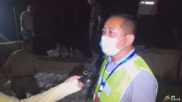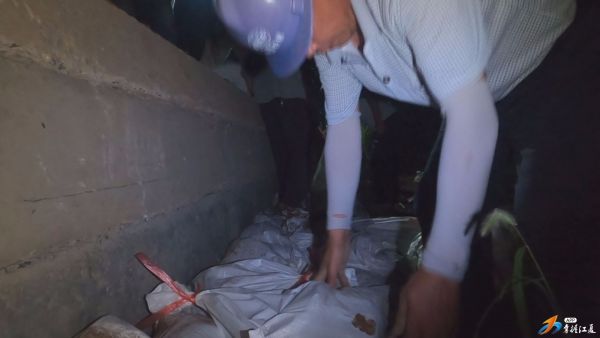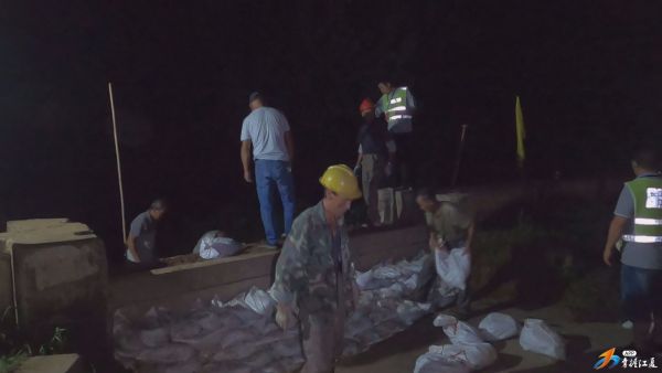 夜幕下,江水潺潺,干堤上依然紧张忙碌,工作人员正举着手电筒,来回穿梭,将装有粘土的编织袋码放在闸口处,用以抵御不断上涨的江水。