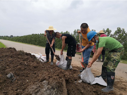 ▲李玥(左二)与值守人员一同装土做土坝