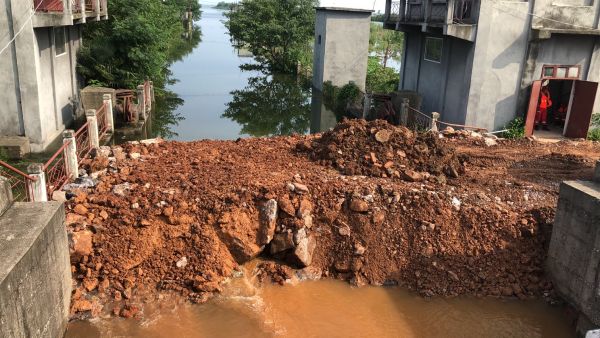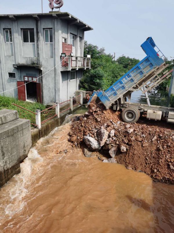 经过23个小时持续作战,现场共抛填砂石、土料247车共3700吨,筑起底宽33米、面宽5米的砂石坝,成功拦截斧头湖湖水进入金水河。