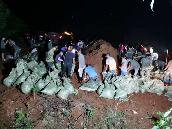 新河船闸溢水险情发生后,急需砂石、土料封堵船闸囗。晚7时,法泗街武装部部长李涛组织32名突击队员和70名村民携带铁锹、编织袋等物资装备迅速赶至闸口附近的珠琳村,并将人员迅速分为三组,分别进行土包灌装、扎袋及装车。经过5个多小时的奋战,100多人用人力装填土包7000余袋,装车10辆。