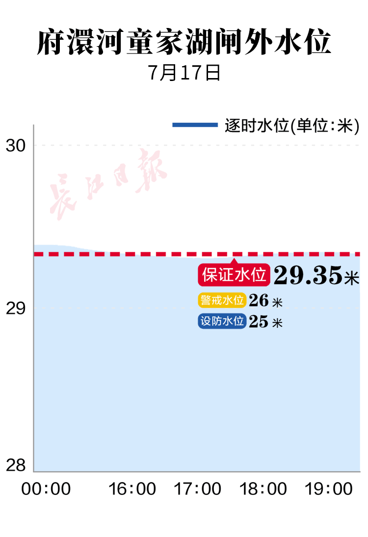 长江日报-长江网7月17日讯(记者黄师师)17日19时,河道水情监测数据显示,府澴河童家湖闸外水位达到29.41米,超保证水位0.06米。