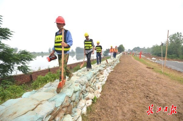 7月17日,防汛工作人员在朱家河大堤上拉网式巡查。 记者喻志勇 摄