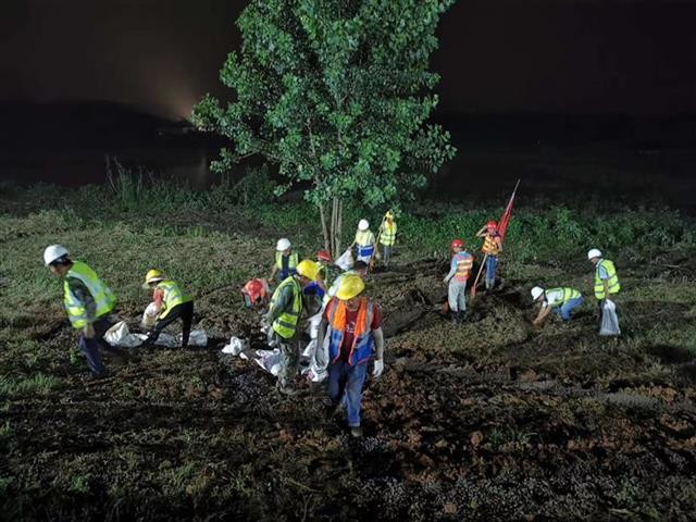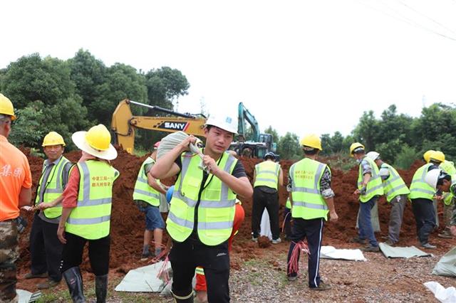 防汛突击队队长何雷军和陈彬、赵博磊等三人曾参与武汉雷神山医院建设和维保工作。面对汛情,三人挺身而出,短短1小时,集结100余名抢险队员,30余台套挖掘机及运输车辆。一到现场,何雷军挽起裤腿跳下车迅速发令:“快快快!先装沙袋!”突击队员拎着铁锹赶到堤内,顾不上吃饭和休息,配合当地民兵组织,四个小时填装防汛用沙袋2000余个。