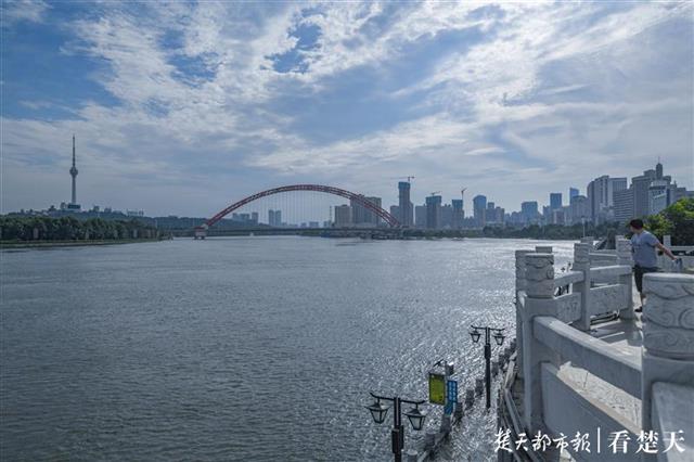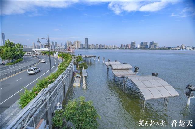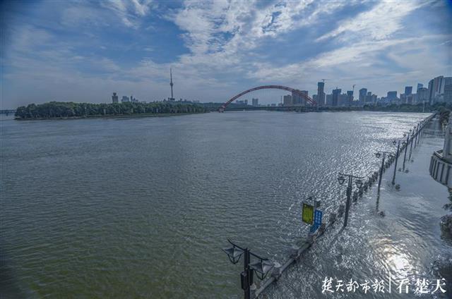 位于两江交会地的汉口龙王庙,一直以来都是武汉防汛的重中之重。7月22日下午5时许,2号洪峰来临前,长江汉口站水位显示为28.57米,记者在龙王庙值守点看到,亲水平台已被洪水淹没,防汛值守人员或值守或巡查,两江交会处,虽长江水与汉江水颜色区别明显,但在蓝天白云下,宽阔而平静的江面显得格外静谧。