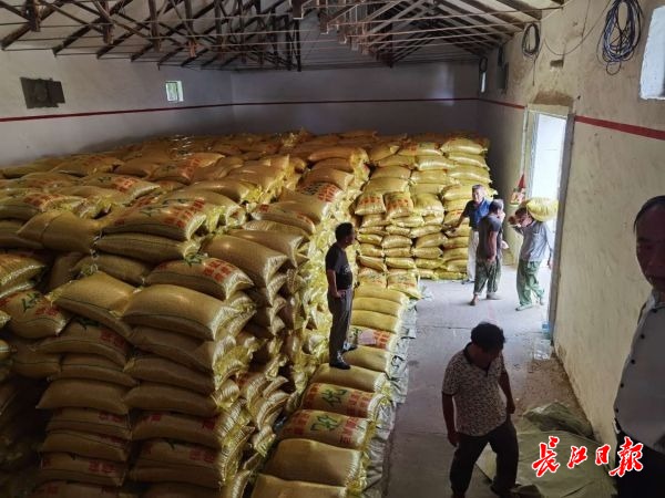 长江日报-长江网7月24日讯 在江夏区金口范湖粮站内,一袋袋黄豆被整齐码放。江夏区发改局粮食安全管理办公室负责人涂才清告诉长江日报-长江网记者,这些黄豆是防汛备料,一共有360吨,分别存放在范湖粮库和金口电排站,目前暂未使用。