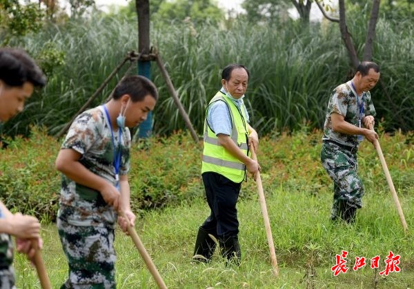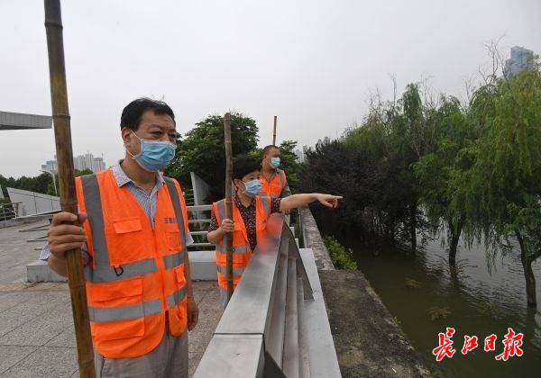 7月25日,余启才(右二)在长江汉阳沿江堤段巡查。 记者史伟 摄