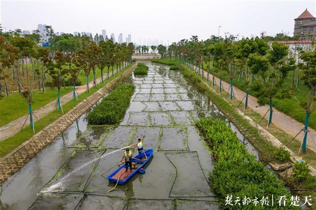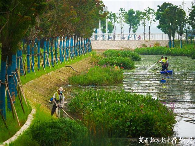 7月25日,在位于黄家湖西路的丽水明渠,记者看到,300米的渠道内,已安置了200余块生态浮框,有工作人员驾着小艇在渠道内进行清理作业,港渠两岸,工人正对护坡上的绿植、花草进行修剪。