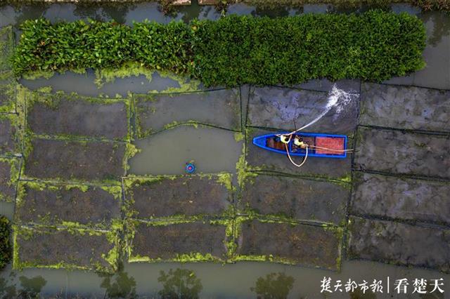 据工作人员余师傅介绍,这些生态浮框已安置了两个多月,每块面积在15平方米左右。其上种植有专门净化水体的狐尾藻,他们要定期清理浮框上的杂物,以保证狐尾藻顺利着床生长。