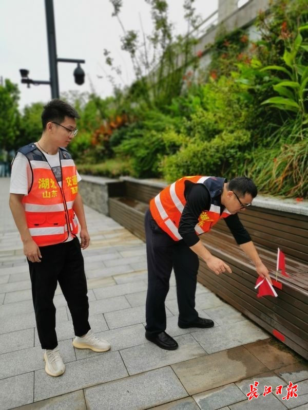 巡查人员用小红旗在堤段渗水处做标记。记者陈俞 摄