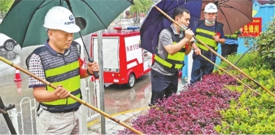 关顺广、张赫然、尹军生(从左至右)在江堤下花坛中查险。