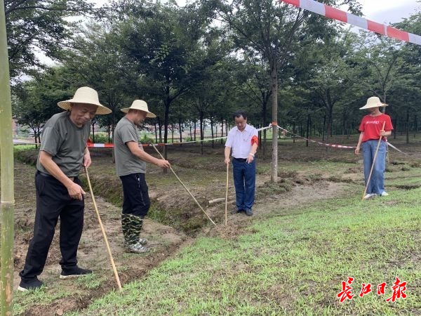 在该堤段堤脚一处散浸点,已开挖有30厘米深、20米长引流沟,并用彩带环绕示警,每次巡查,该哨棚巡堤人都会在此仔细观察。