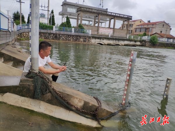 长江日报-长江网7月29日讯 27日下午,天空中飘起小雨,江夏区法泗街新河村党支部书记曾文沿着金水河大堤巡查,关注着水位变化。新河村位于金水河与斧头湖的交界处,负责巡查1.5公里的大堤,在堤上有新河村的3个书记坐镇,分别是村支书曾文、村里的老书记曾祥勇和驻村第一书记朱时进。他们分别发挥自己的优势,守卫大堤保护家园。