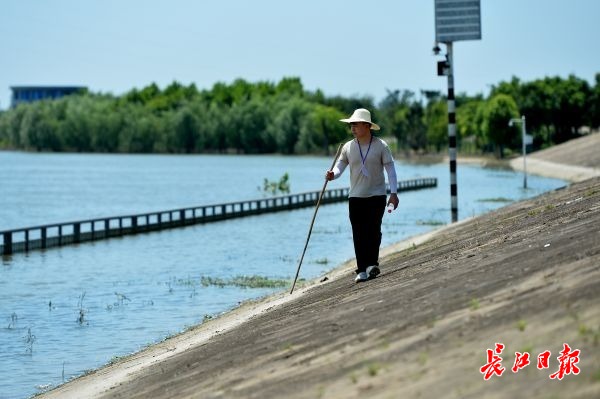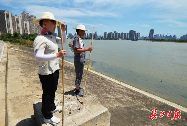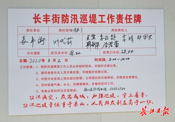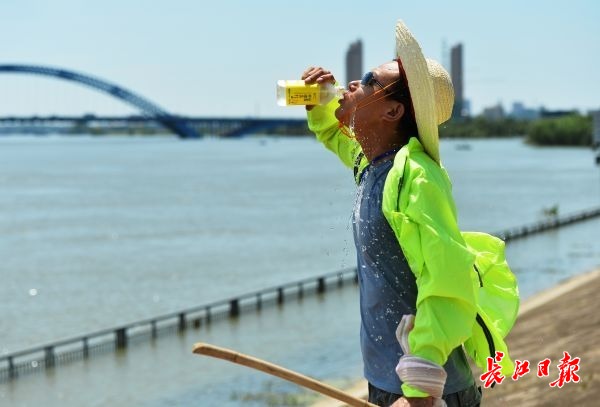 长江日报-长江网8月2日讯 8月2日,在汉江24.5公里险段硚口区长丰街防汛值守点,由街道办事处、派出所民警和辖区华生地产的职工组成防汛队伍,头顶烈日在大堤上值守。当班的责任人叶代莉介绍,虽然目前江水总体趋势呈缓慢回落状态,但一点也不能大意。记者喻志勇摄影报道