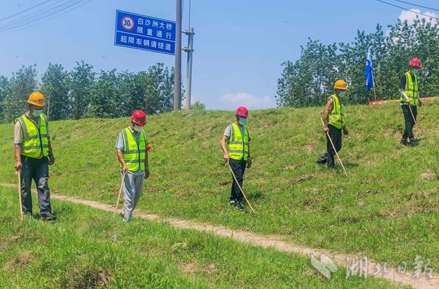 8月4日,中国一冶防汛人员冒着高温,在长江武金堤进行常态化巡查。入汛以来,中国一冶洪山江滩项目部安排施工管理人员24小时轮流值守,对3.2公里的武金堤责任段堤外护坡、压浸台、生态水沟沿线进行管涌险情排查。近日水位连续下降,但他们丝毫不放松警惕,严格按照防汛要求检查是否发生散浸、溃堤现象,并对水位进行实时监测。(湖北日报全媒记者 梅涛 通讯员 姚京 况达喆 摄)