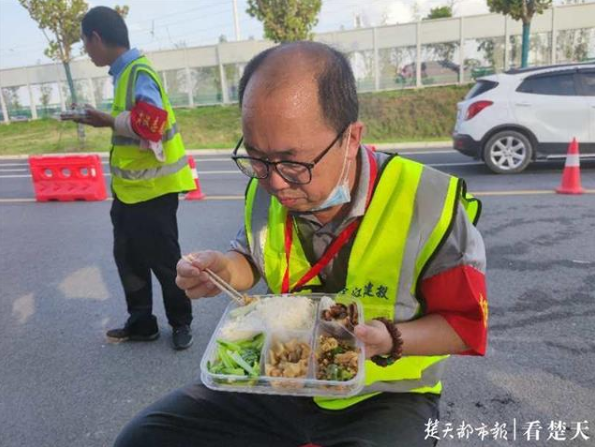棚长董恒信巡查外堤归来,吃工作餐