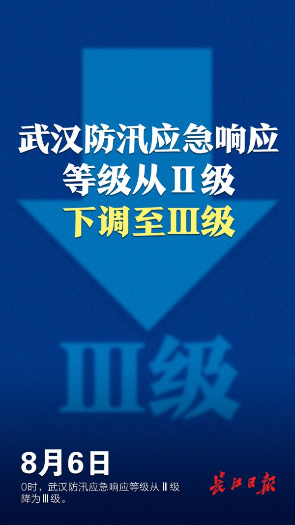 长江日报-长江网8月6日讯(记者黄师师 通讯员廖宇智)6日0时,市防汛抗旱指挥部办公室宣布,武汉防汛应急响应等级从Ⅱ级调整至Ⅲ级。