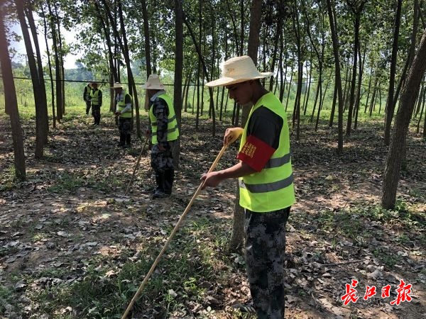 卡地江·买买提(最右)冒着高温巡堤查险,草帽下是一张早已晒得黝黑的脸。 记者陶可祎 摄