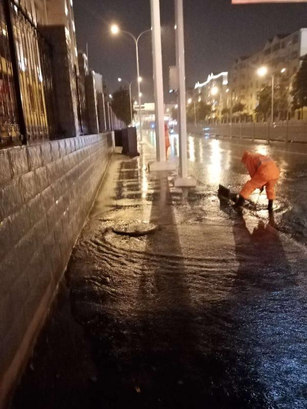 城市排渍人在暴雨中清除堵塞窨井的杂物。通讯员郑志峰供图